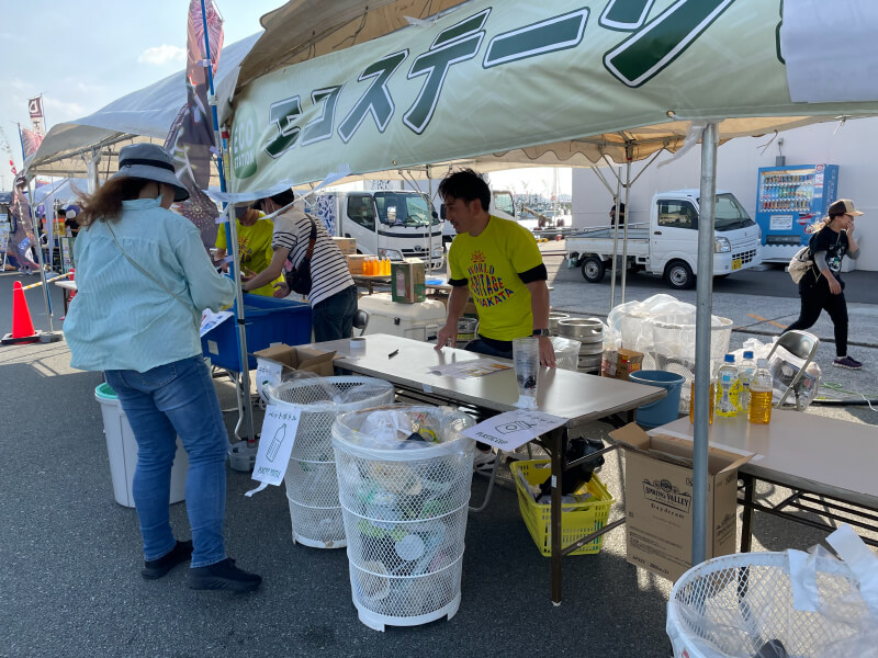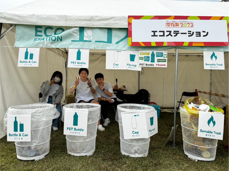 「宗像フェス」をはじめ福岡県内のイベント会場でごみの分別を行い再生プラスチック原料としてペットボトルを回収するエコステーションを運営しています。